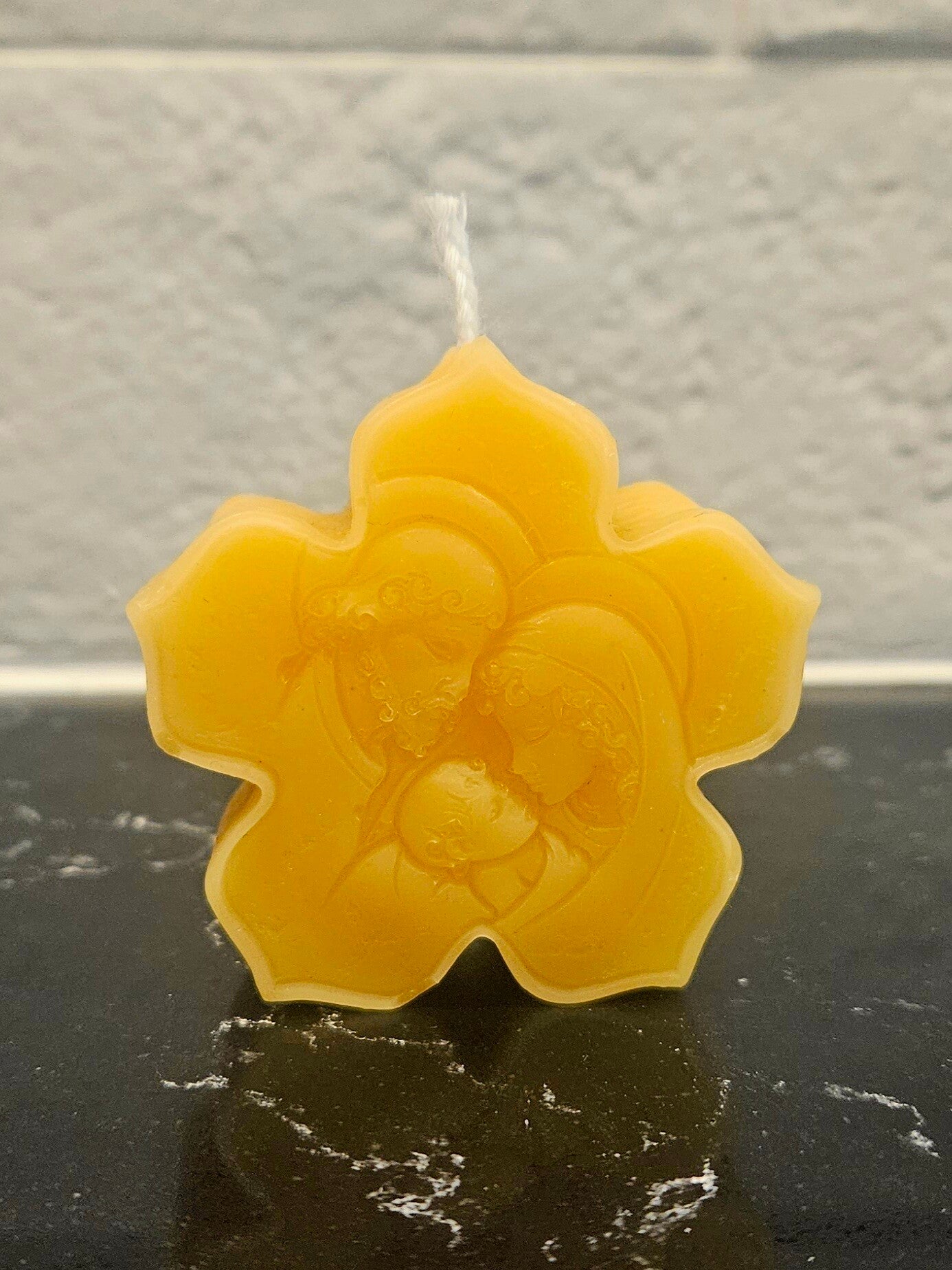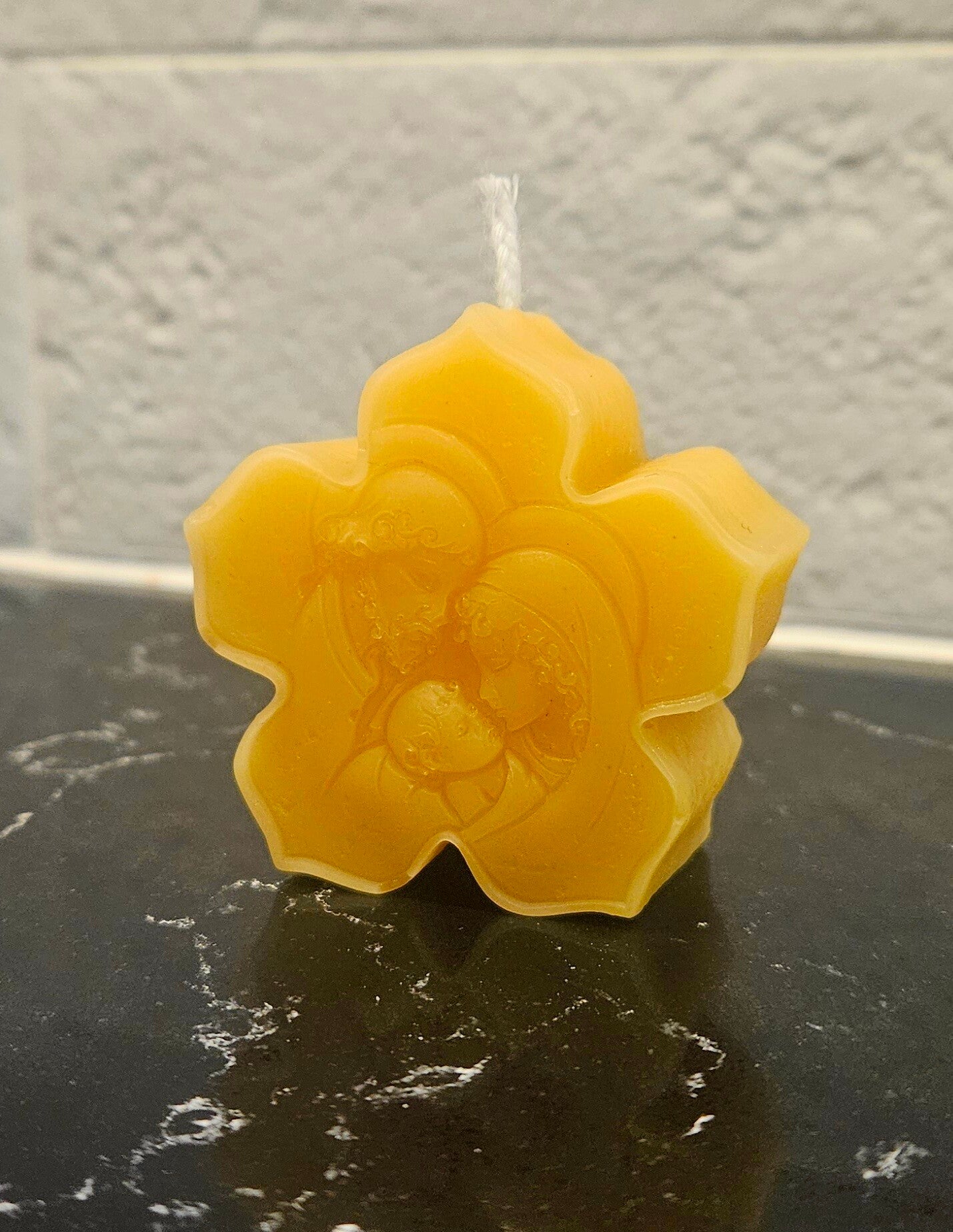 A small but sweet candle of the Scared Family in the shape of a flower.
